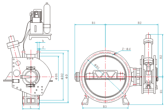 該蝶閥開(kāi)啟、關(guān)閉均靠液壓驅(qū)動(dòng),可在90°范圍內(nèi)調(diào)節(jié)蝶板快、慢兩階段關(guān)閉角度,可立臥兩式安裝。